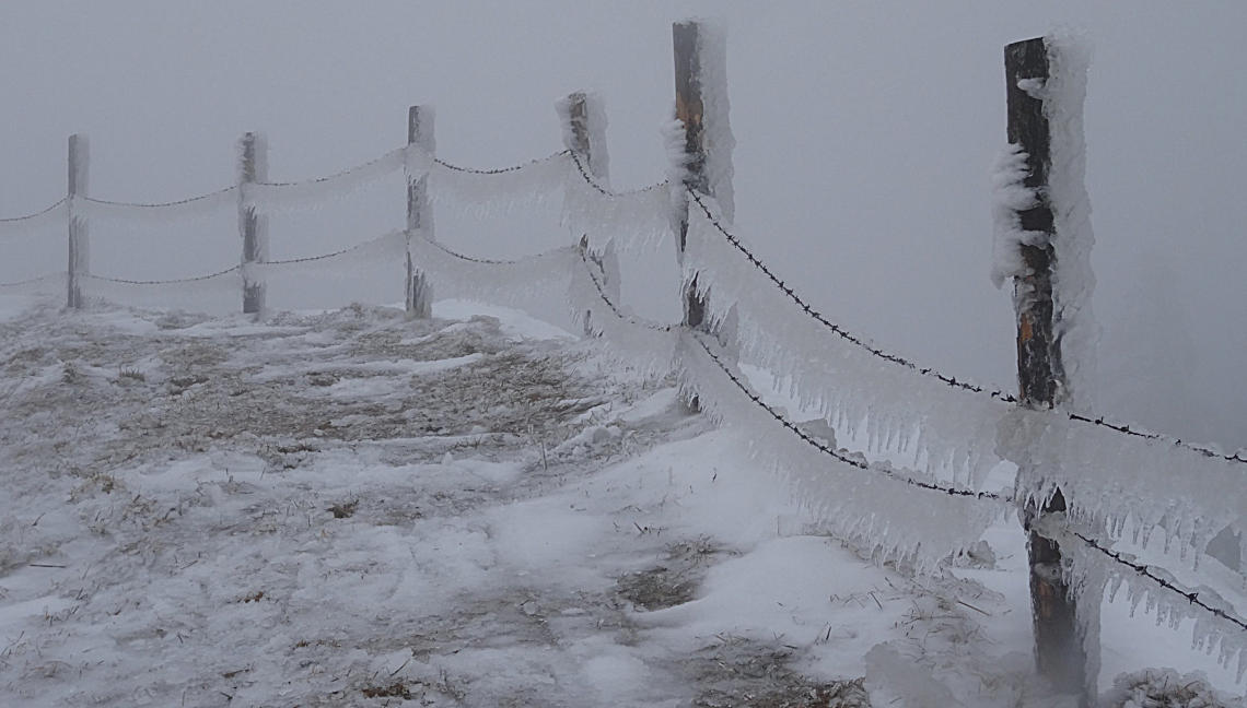 Der gefrorene Regen am Stacheldrahtzaun gefällt uns beonders. Der Aufstiegsweg zum Dürrriegel ist teilweise vom Wind abgeweht.