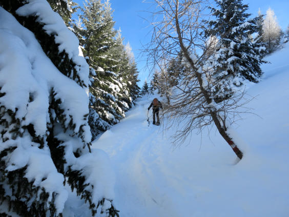 Wie man an den Bildern erkennen kann ist der Aufstieg auch für Skitourengeher geeignet. Quer durch den Wald führt die Spur.