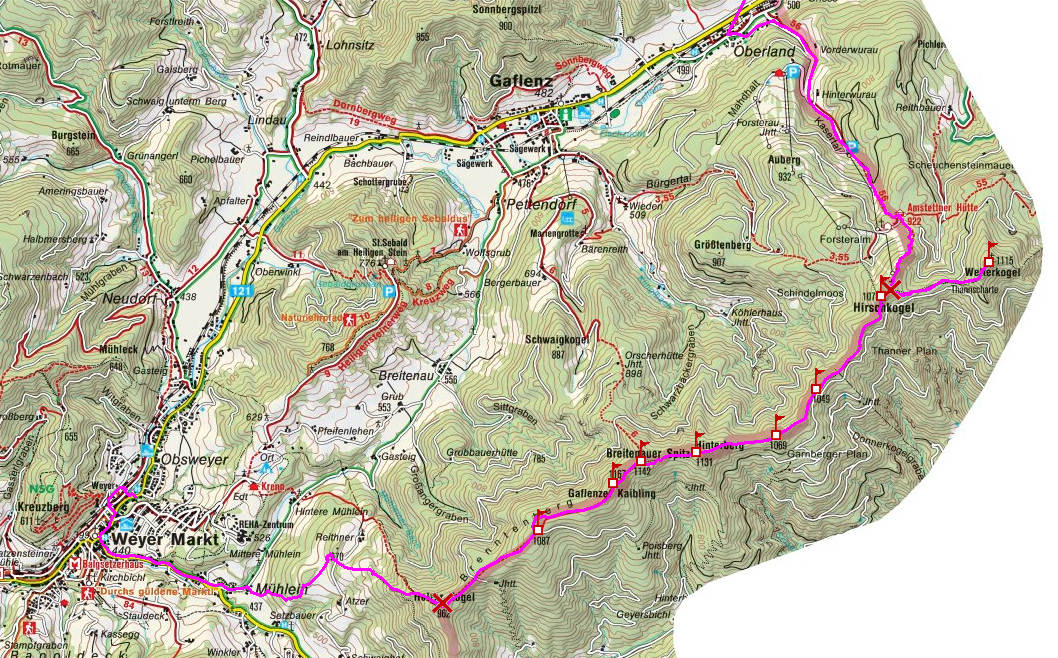 Über den Holzerkogel der unter 1000m liegt gehen wir weiter nach Atzer und vor dort in Richtung Weyer-Markt.