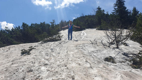 Ab dem Gsenger ändert sich der Weg. Es wird steiler, felsiger und es geht durch viele Latschengassen. und - es liegt noch Schnee.