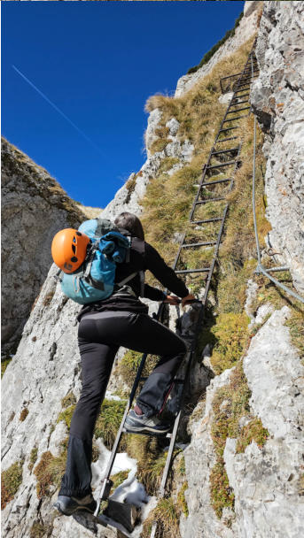Steht man vor der Wand, ist der große gelbe Pfeil nicht zu übersehen. Über viele versicherte Abschnitte führt dieser einfache, aber bei Schnee und Eis doch fordernde Steig hinauf.
