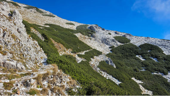 Viele Leute treffen wir heute nicht. Erst am Plateau, beim Raxkircherl sehen wir wen. Es ist kalt, aber es geht kein Wind. Selten hier. Das Karl-Ludwig Haus hat schon länger geschlossen. Dahinter der Predigtstuhl, darunter der eher unangenehme Bismarcksteig. Ganz links das Habsburghaus und ganz rechts noch der Schneeberg.