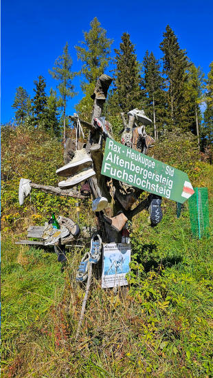 Unser ursprüngliches Ziel auf den Karrersteig zu gehenn wird uns hier durch Holzschlägerungsarbeiten durchkreuzt. Leider ist das nirgends davor ersichtlichlich. Das macht nichts. Elisabeth und ich finden immer Wege. Auch dort wo es keine gibt. Wir ändern somit unseren Plan und gehen über den Reißtalersteig zum Raxkircherl.