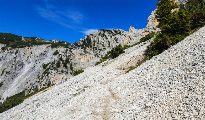 Der letzte Teil kurz vor dem Einstieg zum Steig ist die Querung einer Geröllhalde. Dann geht`s los. Edit`s Erbstbesteigung.