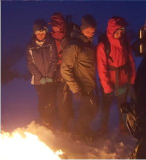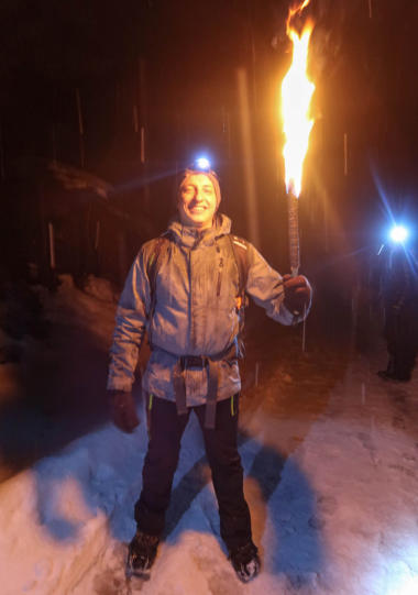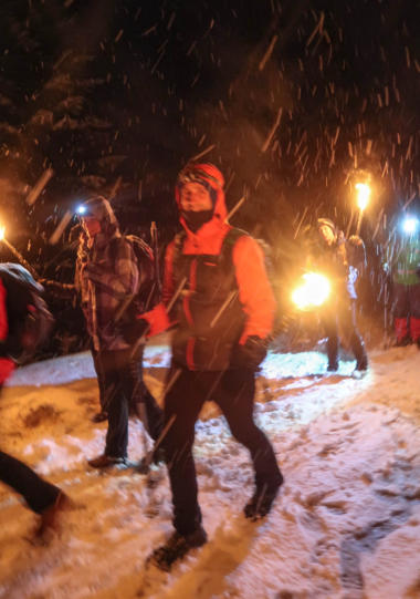 gab, hat sich das Wetter nun auf größere Schneeflocken geeinigt. Bewaffnet mit Stirnlampe und Fackel geht es talwärts.