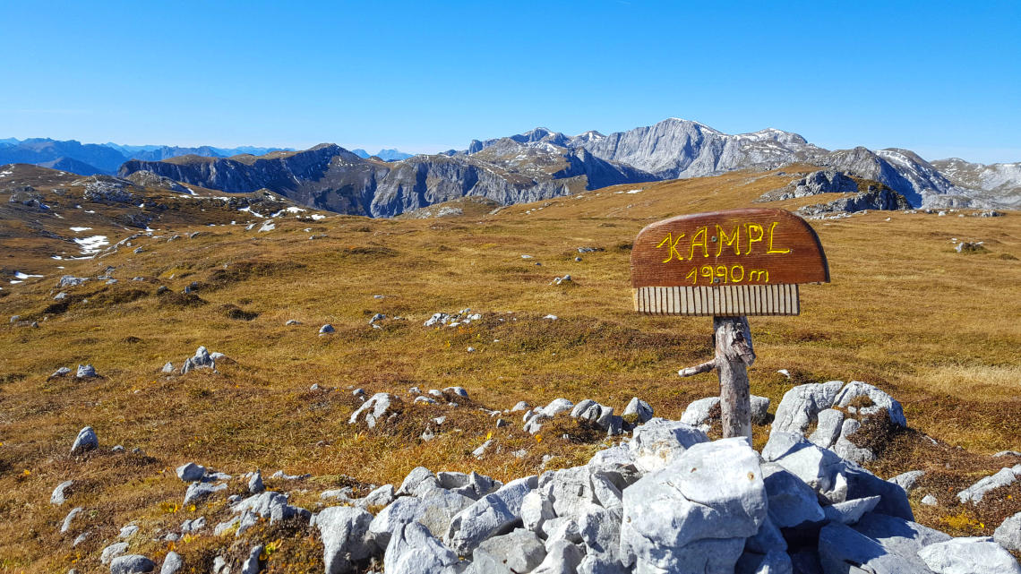 An der kleinen Unterstandshütte nahe des Zlackenkogels vorbei führt der Weg zum Kampl. Ein interessantes Gipfelzeichen.