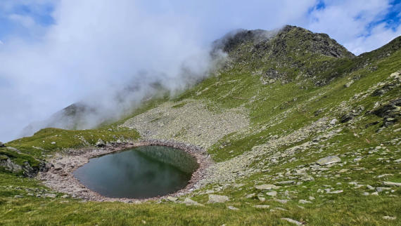 Die kleine Kreuzspitze auf 2.518m. Sagenhaft. Die Wolken ziehen herum. Oft sitze ich minutenlang mitten drin ohne Sicht.