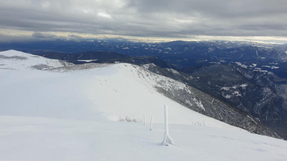 Dazu öfters Triebschnee, manchmal Eisplatten. Mit den Schneeschuhen geht das aber ganz gut, wir kommen zum Gipfelkreuz.