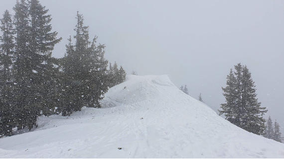 Kurz nach der Wagenbänkealm folgt der Aufstieg zum Lahngangkogel. Die Schneeflocken lassen nur mehr wenig Sicht zu.