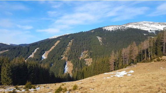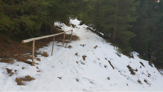 Links im Bild der untere Teil vom Aufstieg zum Seckauer Zinken. Im Schatten auf der Forststraße liegt doch ein bisschen Schnee.
