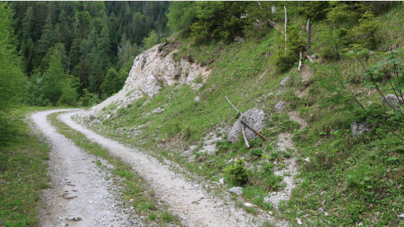 und Kuchen verloren gegangen ist, geht es vorbei und es folgt eine eintönige, fade Forststrasse oberhalb des Schlaggraben.