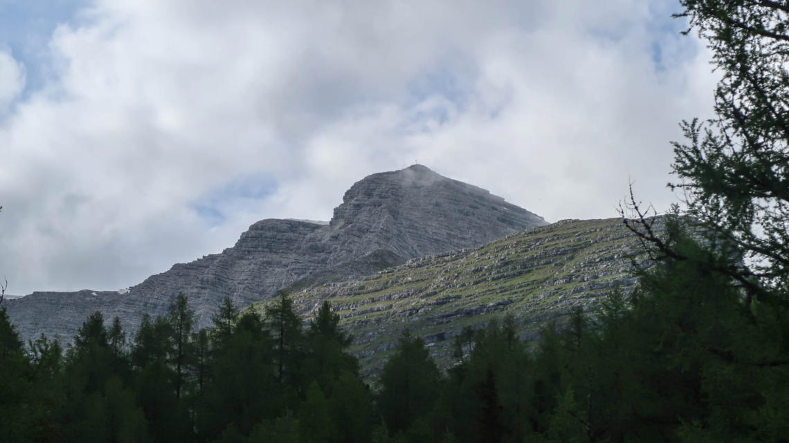 Das Gipfelkreuz von Warscheneck in Schleierwolken... unser morgiges Ziel.