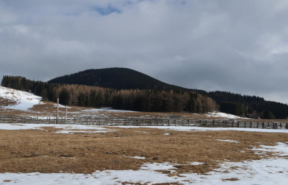 Noch einmal geht es ein Kleinwenig bergan, da vorne ist der Mooskogel. Hier ist auch ein bisschen mehr Schnee.
