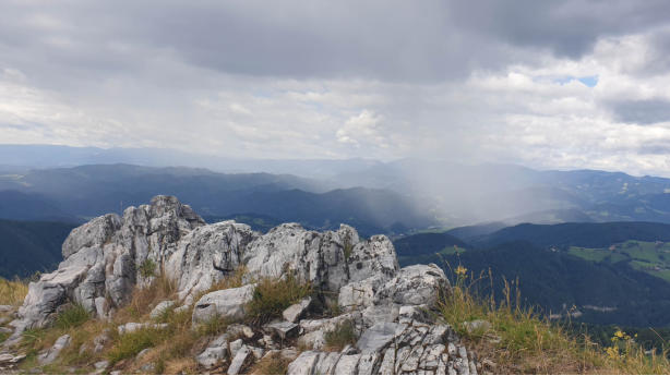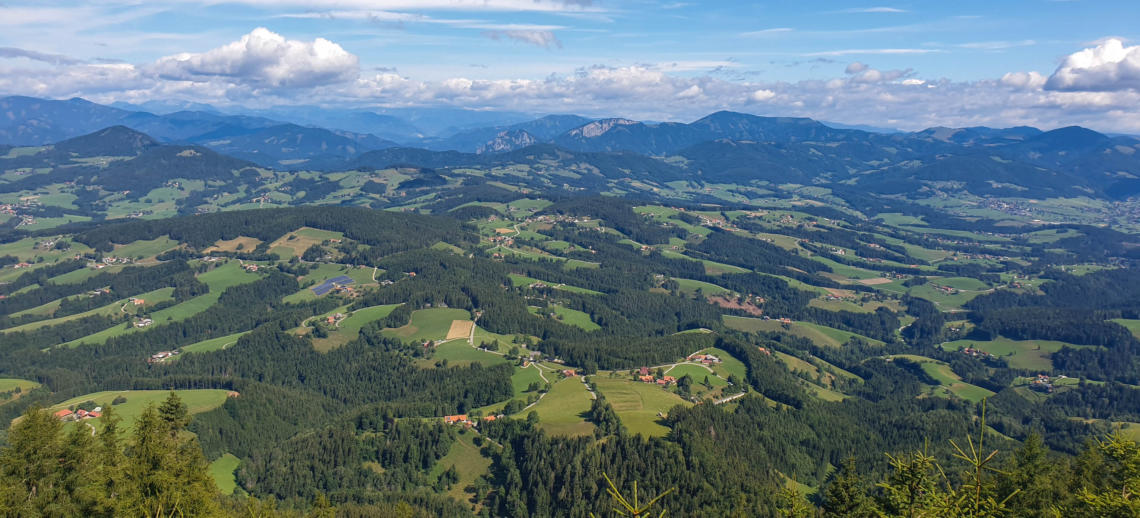 Die Aussicht ist heute hervorragend. Hier ein Blick zur Roten Wand, Rennfeld, Rötelstein, Brucker Hochanger, Heutlantsch, uvm.