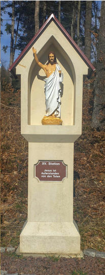 Ich folge dem Kreuzweg nach oben. Ich bewundere die einzelnen Stationen und das riesengroße Kreuz mitten auf der Wiese.