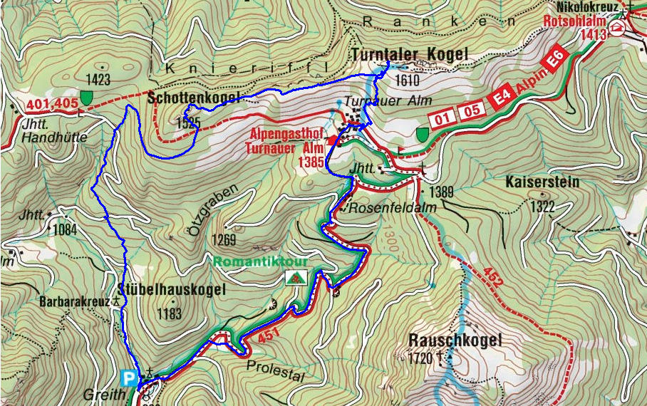 Über die Rosenfeldalm und das Prolestal geht es über die Forststrasse wieder hinunter nach Greith.