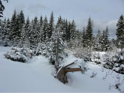 Ab ca. 900m wird es bedeutend winterlicher. Der harschige Schnee hat eine gut 10cm hohe Pulverschicht.