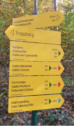 Höhepunkte gibt es auf dieser Tour keine. Der höchste Punkt ist jedoch der Troppberg mit seiner Warte. Er liegt in einer der Kernzonen des Biosphärenparks Wienerwald. Vom 542 m hohen Troppberg bietet sich eine herrliche Aussicht auf Wien, auf Tulln, Richtung Wachau und ins Alpenvorland mit Schneeberg und Ötscher. Heute aber leider nicht. Es ist zu dunstig.Dafür gibt es kurz vor dem Aussichtsturm jede Menge Tafeln....
