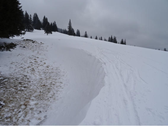 Gipfelbereich vieles abgeweht. Es reicht aber gerade um nicht abschnallen zu müssen. Langsam, damit der Belag nicht kaputt wird.