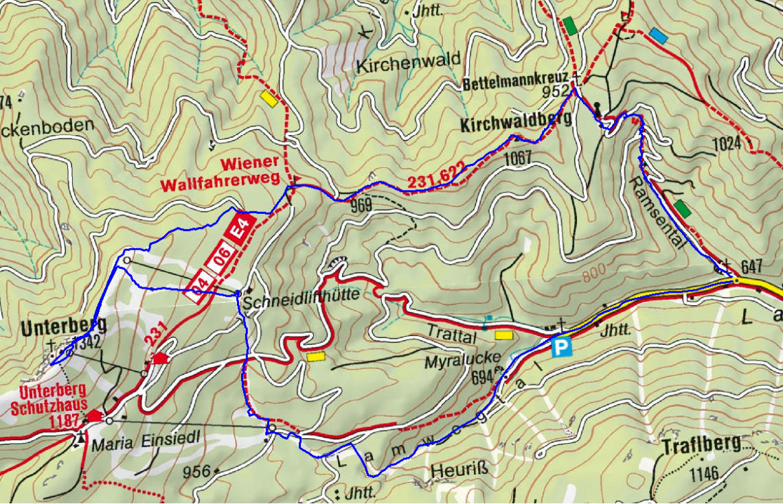 Die Tour ist insgesamt 10km lang. Davon sind es 6km bis zum Gipfelkreuz des Unterberges. Bis dort hin sind es 780Hm.