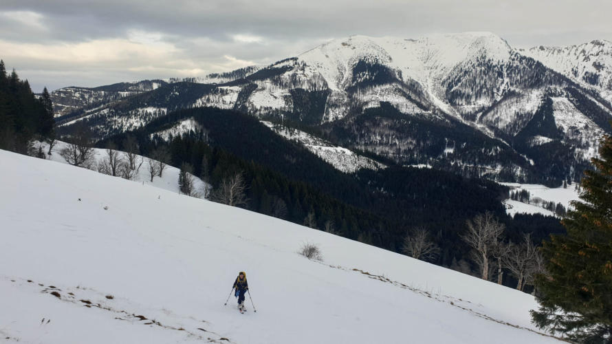 Wenig bis keine Sonne. Aber auch nicht kalt. Der Göller gut zu sehen. Wenig Schnee, wenig einladend für eine Skitour.