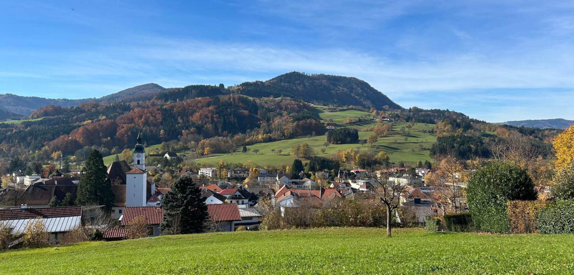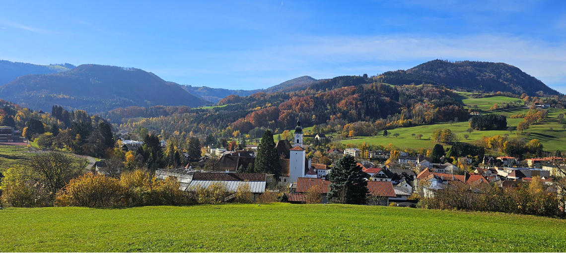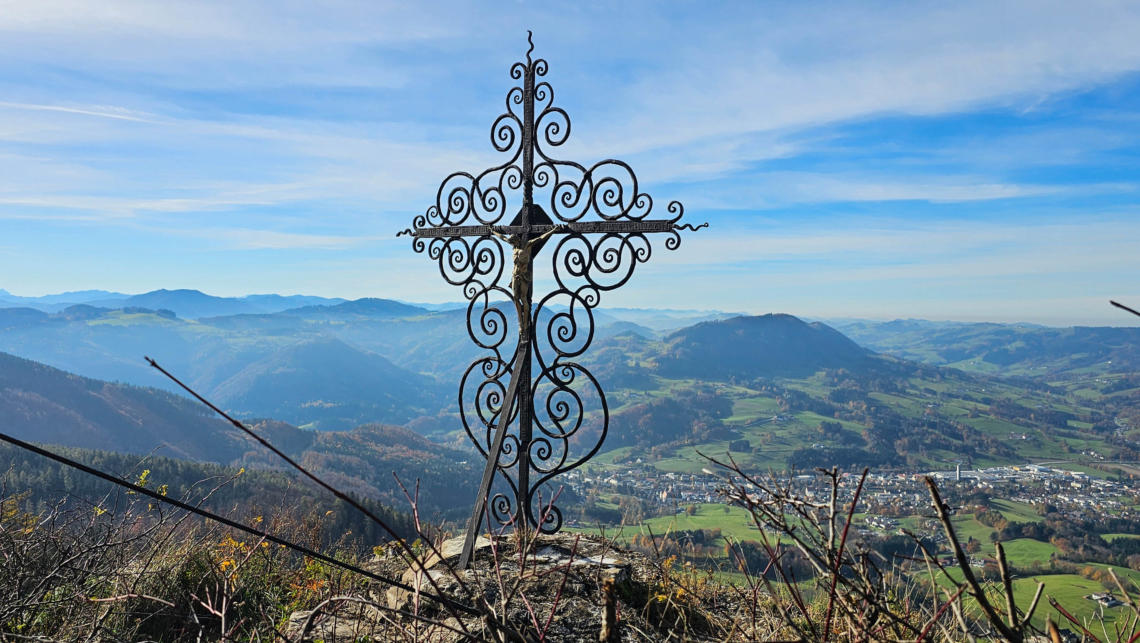 Kreuze gibt es hier einige. Dieses wunderbare Kunstschmiedekreuz gefällt Olga und mir am Besten mit Blick auf Scheibbs.