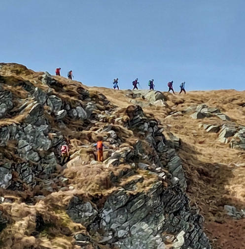Die Überschreitung vom Nageleck bis zu den Etrachböden erfordert einiges an Trittsicherheit. Fröhliche Gesichter rundum. Schön.