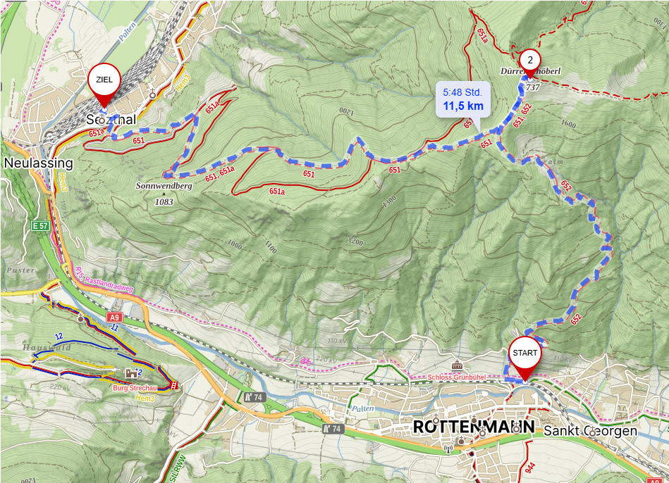 Vom Bahnhof Rottenmann ist man in gut 10 Minuten beim Ausgangspunkt auf das Dürrenschöberl. Zeit: 3 Stunden.