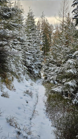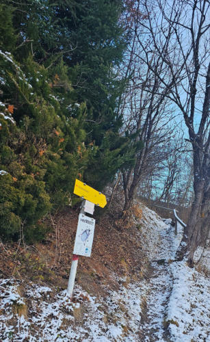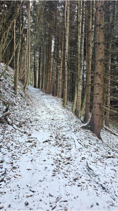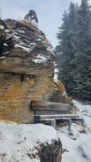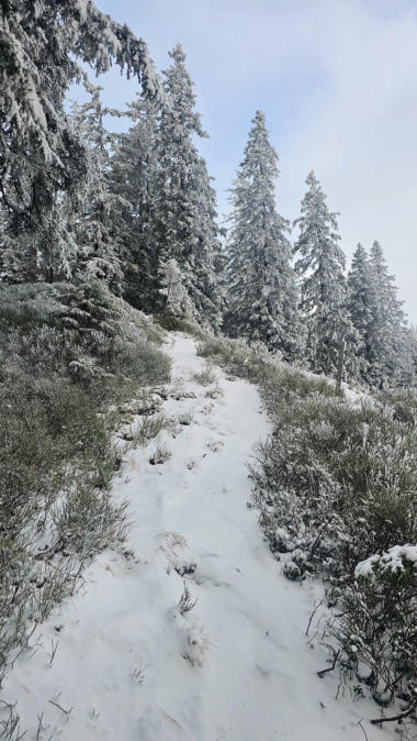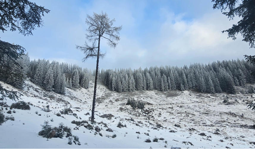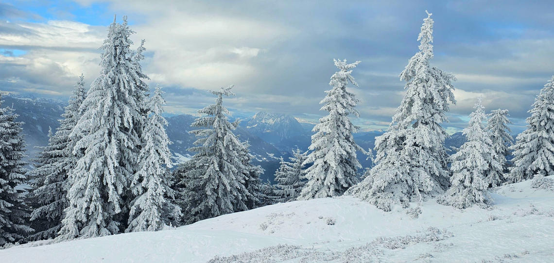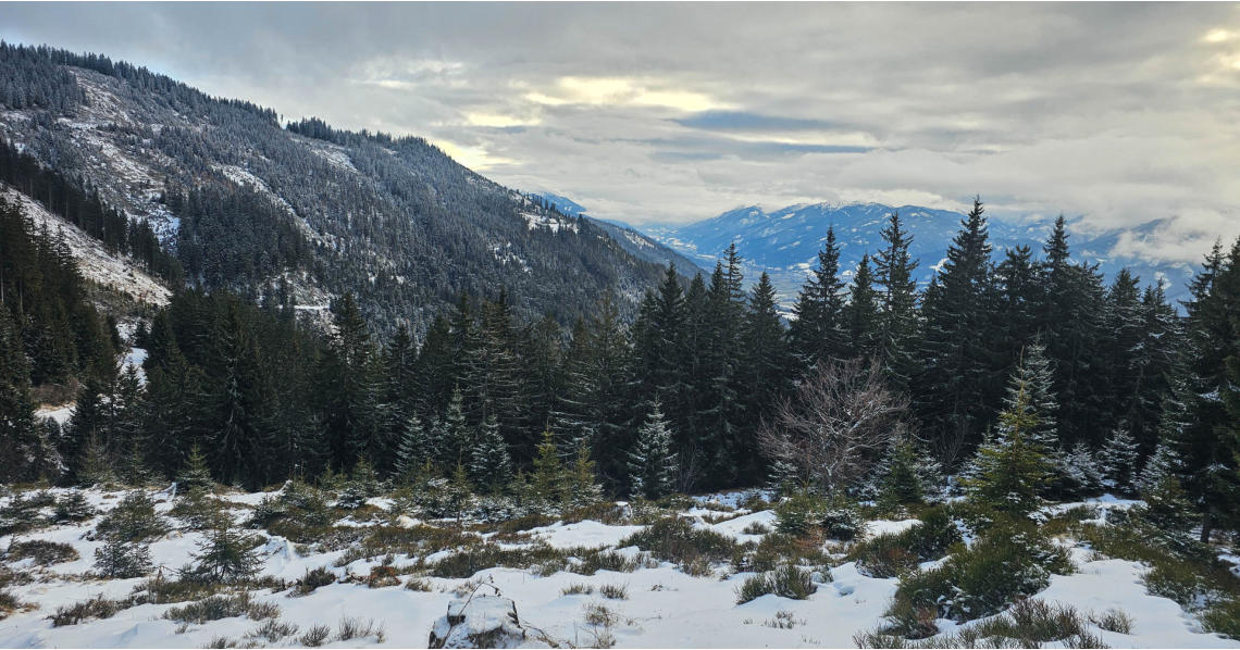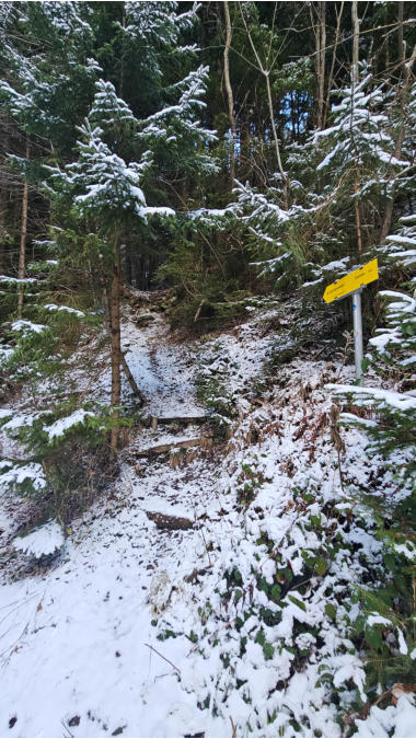 Aussicht gibt es nur am Start und dann erst wieder im oberen Bereich. Es liegt wenig Schnee, Grödeln sind aber sehr vorteilhaft.