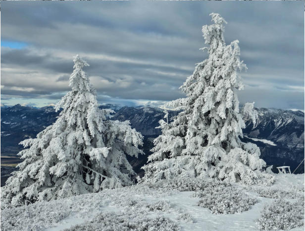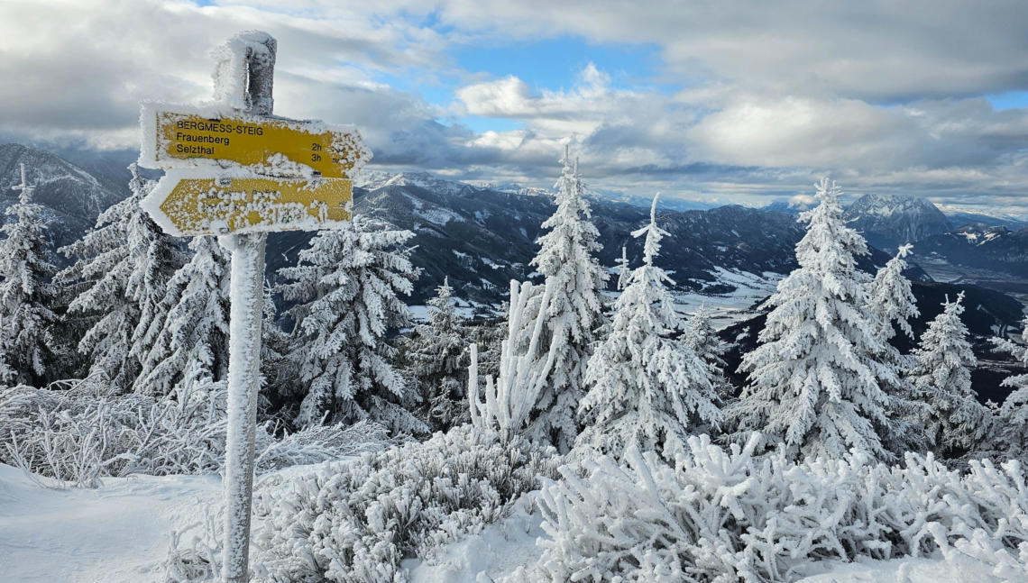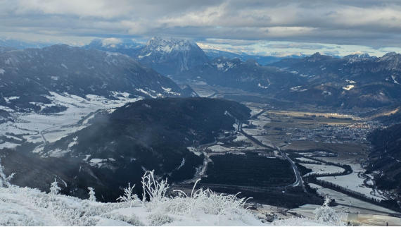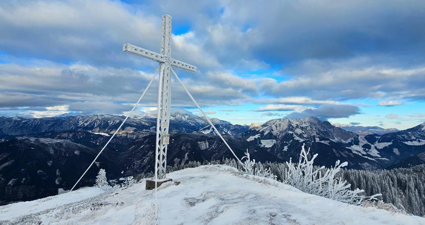 Der Raureif, ein paar Sonnenstrahlen dazu... also das war schon recht kitschig am Gipfel. Mittig hinten der Grimming.