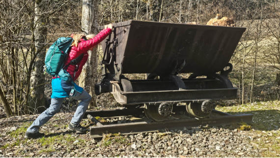 Romana versucht vergeblich die Lore zu Kippen, für`s Dehnen ist es aber eine perfekte Gelegenheit.