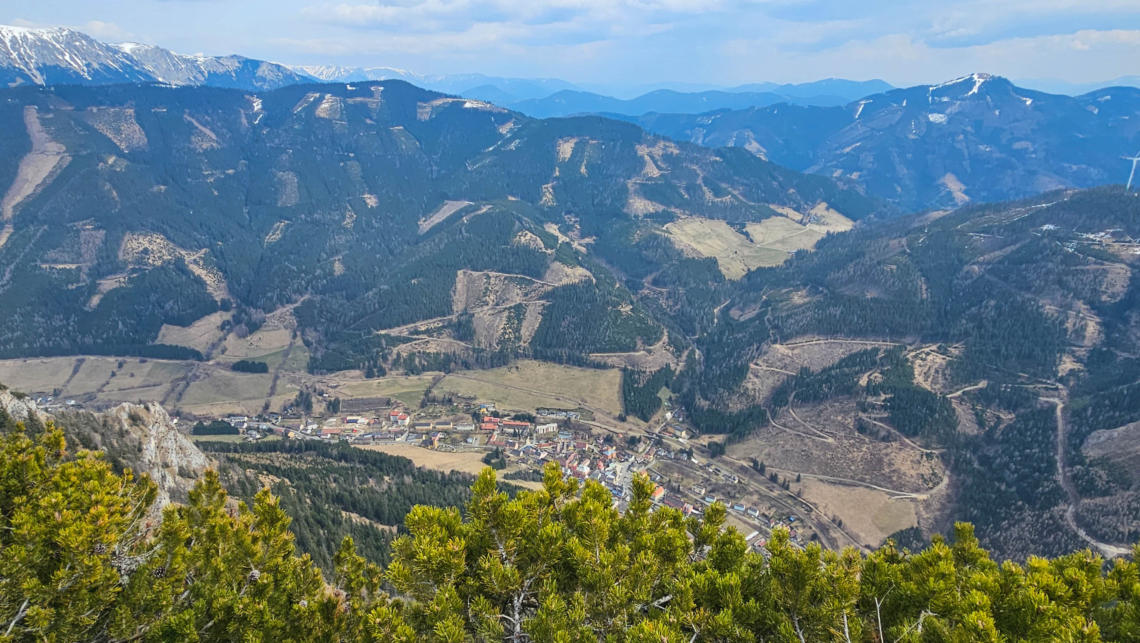Ein Blick nach Vordernberg. Rechts mit Schnee der Thalerkogel, links vorne der Große, bzw. der Hohe Schilling.