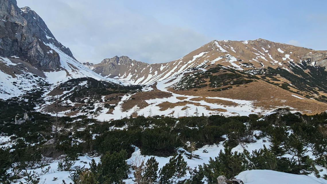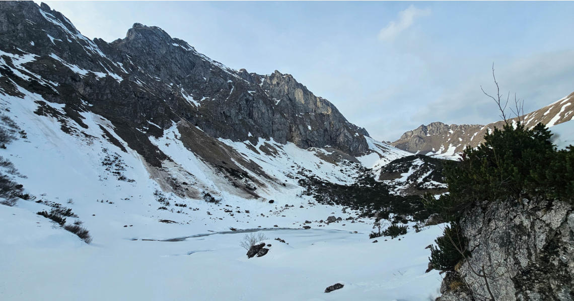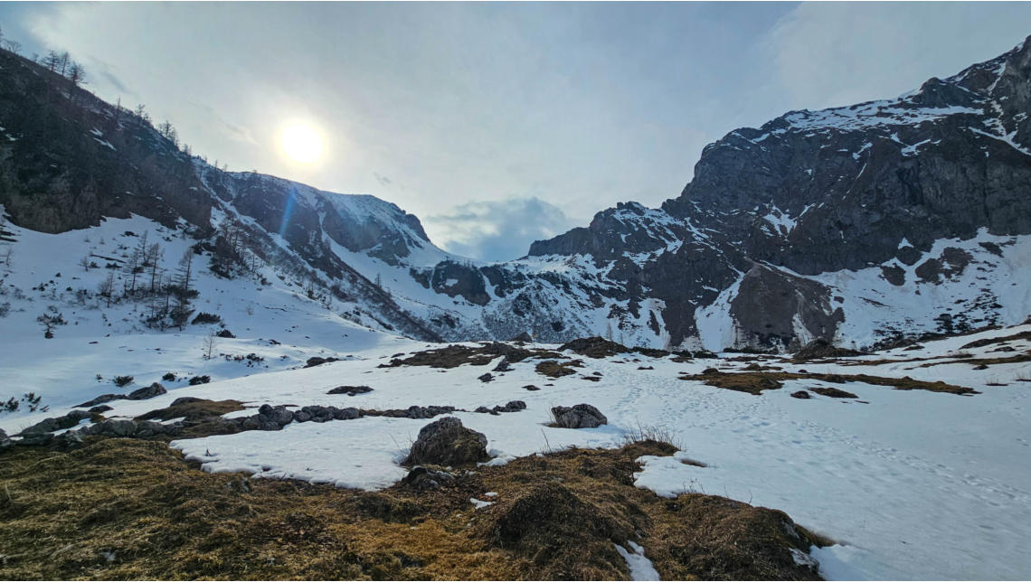 Da gab es schon einige Lawinen vom Reichenstein, davor der noch gefrorene Krumpensee, hinten das Rottörl und der Grüblzinken.