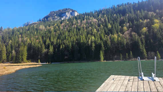 Wir sind wieder am Spechtensee angelangt. Im Hintergrund der Nojer, davor der See mit +8°. Es waren noch einige Badeplätze frei.