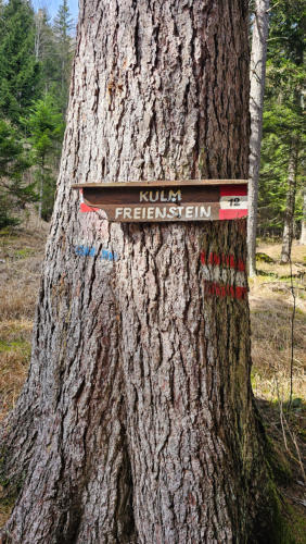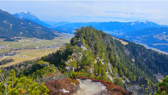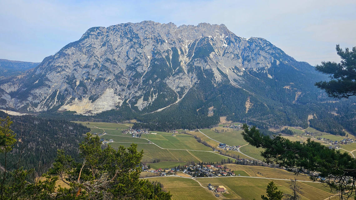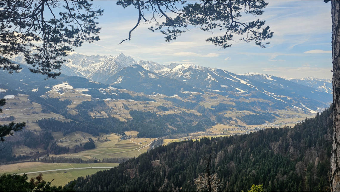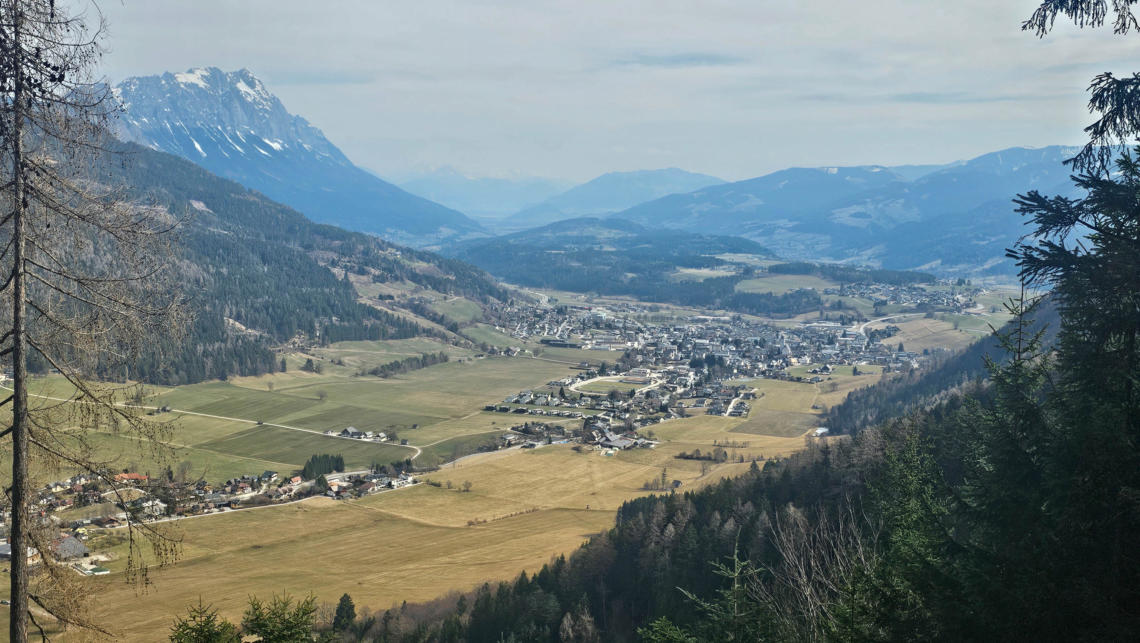 Es dauert bis man den ersten “Durchblick” hat. Bedingt durch die geringe Ausgangshöhe (780m) geht man lange Zeit im dichten Wald. Dafür wird man dann reichlich mit herrlichen Ausblicken in die Umgebung belohnt. Hier der erste Blick nach Gröbming. Gröbming ist eine Marktgemeinde mit 3.300 Einwohnern.