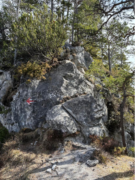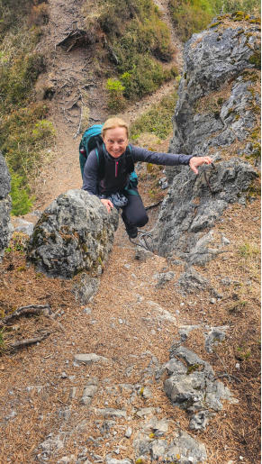 Hier im Bild links ist Romana in der Umgehung der Schlüssselstelle der Tour. Man könnte sie auch direkt im Abstieg gehen, diese ist jedoch mit großer Vorsicht zu genießen. In die Gegenrichtung ist sie wesentlich einfacher. Auch diese Stelle in Bildmitte kann man direkt absteigen. Wie der rote Pfeil zeigt ist der einfachere Weg jedoch seitlich hinauf.