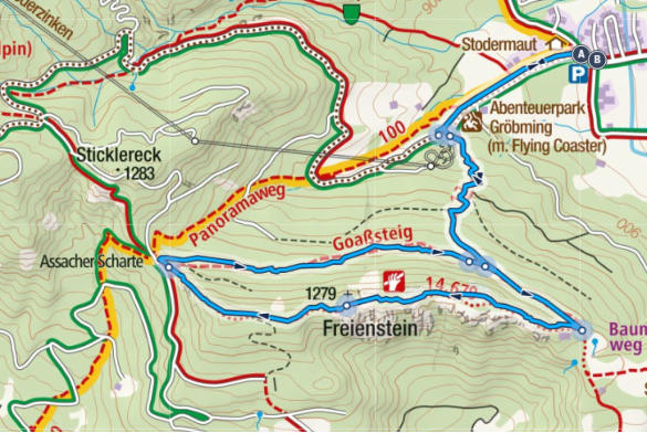 Der Freienstein ist ein Berg im Dachsteingebirge. mit 1.279m Höhe. Eigentlich ein kleiner Berg in der Relation zur Umgebung. Und dennoch, der kleine hat es schon seine Ecken und Kanten und von einem Spaziergang ist diese Runde weit entfernt.Meine Freundin Romana und ich haben uns heute für diese Runde mit Ausgangspunkt Stodermaut entschieden. Gleich neben dem noch geschlossenen Abenteuerpark geht es los. Hier der wunderbare Flying Coaster. Braucht man das wirklich hier?