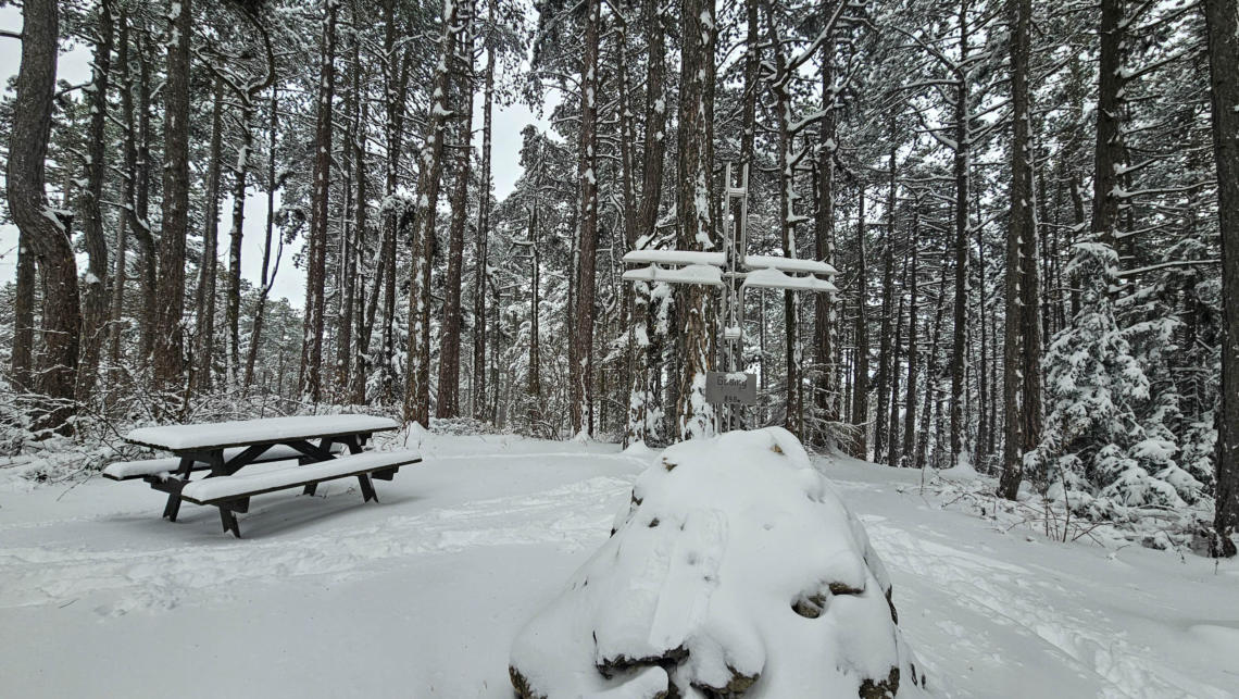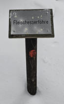 Hier sind wir bei der Fleischesser-Föhre. Na zum Glück haben wir ja heute nur eine Käsesemmel dabei.