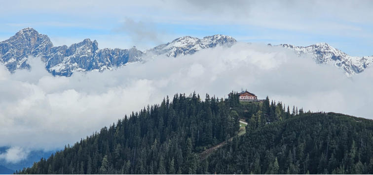 Vom Rossfeld haben wir einen guten Blick zurück zur Bergstation am Hochwurzen und dahinter den Dachstein.