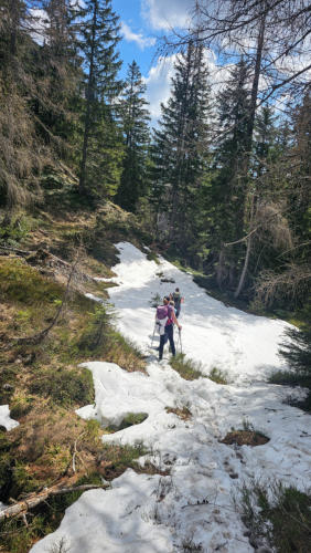Und dieser ist schon eine ganz andere Kategorie. Vorerst müssen wir aber noch durch einige harmlose Schneefelder hinunter nach
