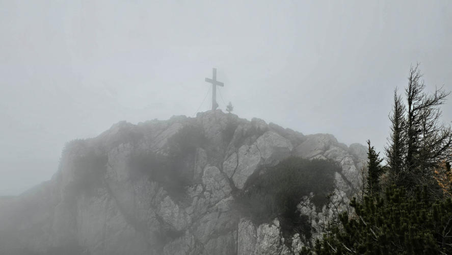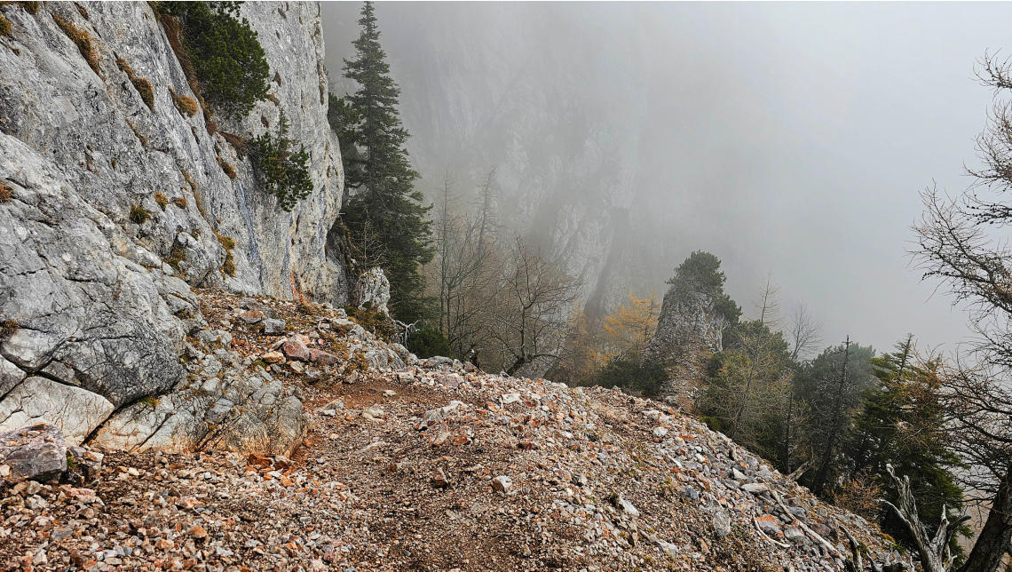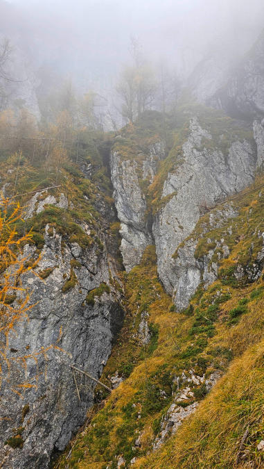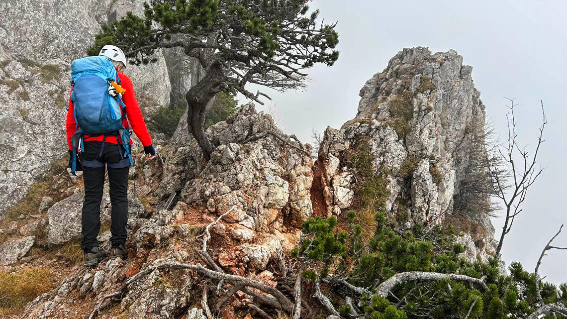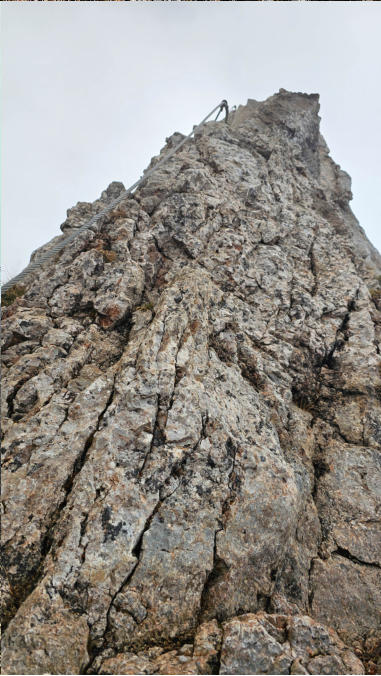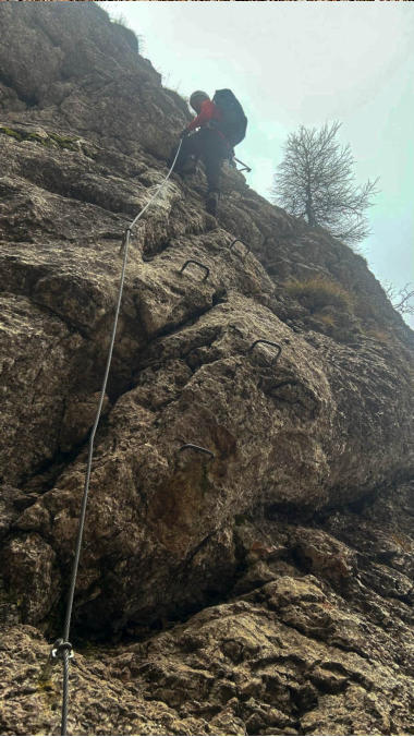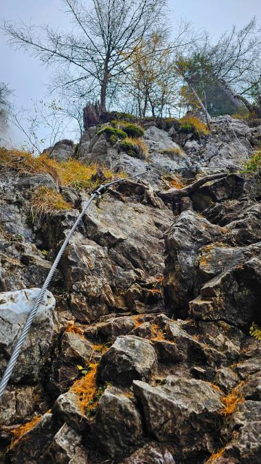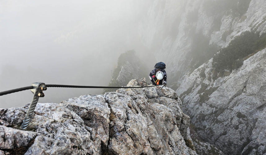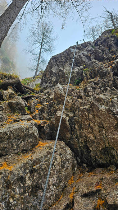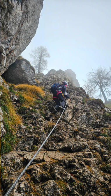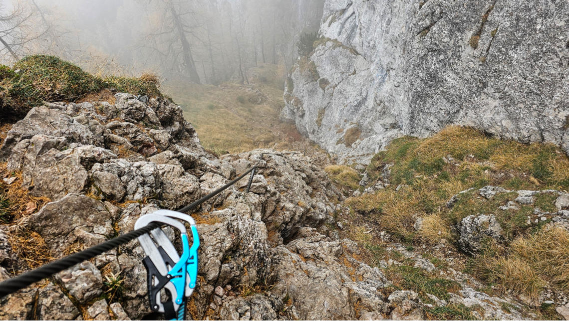 Der Steig ist gut versichert. Immer wieder ziehen dichte Nebelschwaden über uns, der Ausblick daher eher bescheiden.