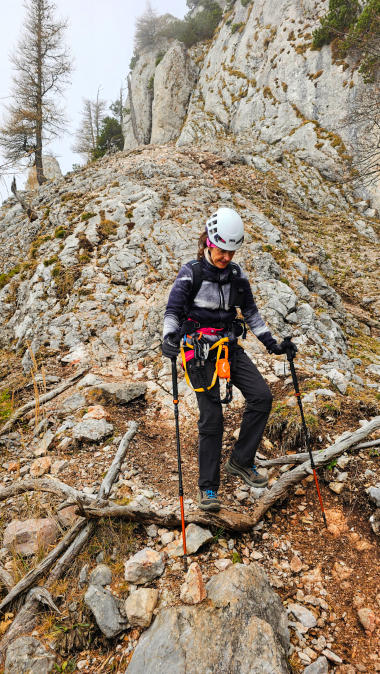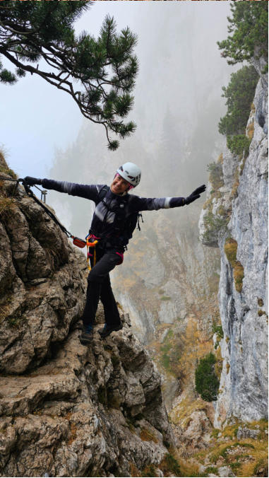 Olga fühlt sich auf einem Klettersteig immer wohl. Egal ob Sonne, Nebel, trocken oder feucht. Es macht ihr einfach viel Spaß. Gut so.
