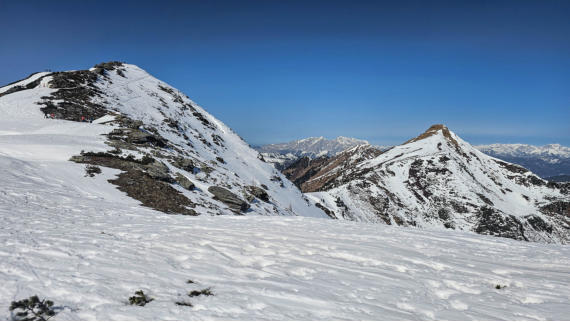 Wir müssen in diese Richtung weiter. Unser Ziel Jochspitze und die Karlspitze. Sieht auf den Bildern alles flacher aus, als es ist.