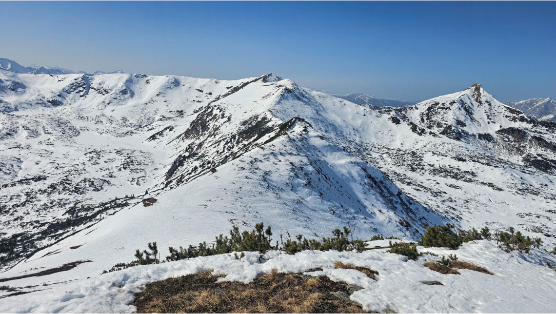 Ein Rückblick zur heutigen Tour. Karlspitze, Friedenskreuz in der Mitte die Goldbachscharte und rechts die Schoberspitze.
