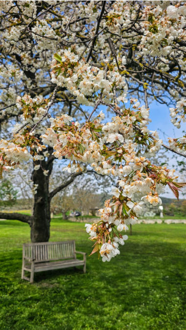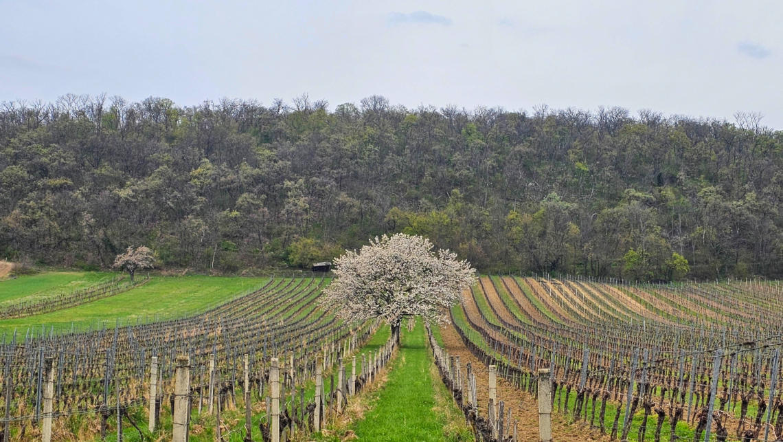 Schön war es dort, schön ist es hier. Waren es gestern die Marillenbäume und Weingärten, sind es heute die blühenden Kirschbäume.