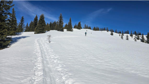 Ab der Alm ist nicht nur bedeutend mehr Schnee, es wird auch deutlich steiler. Romana meist voran spurt wieder bestens. Danke.