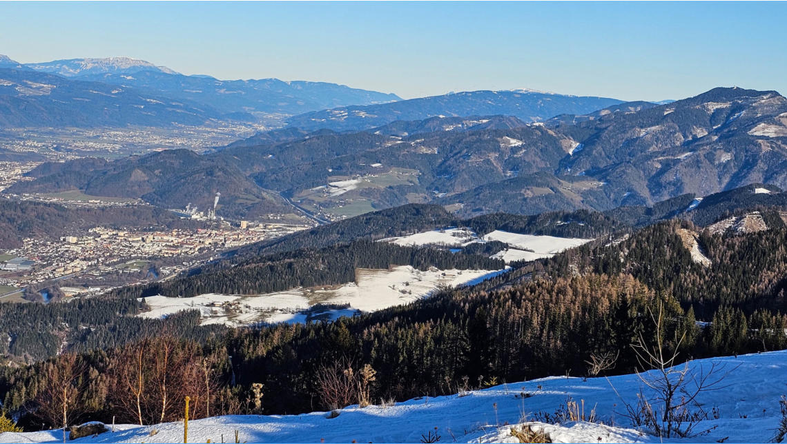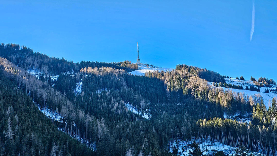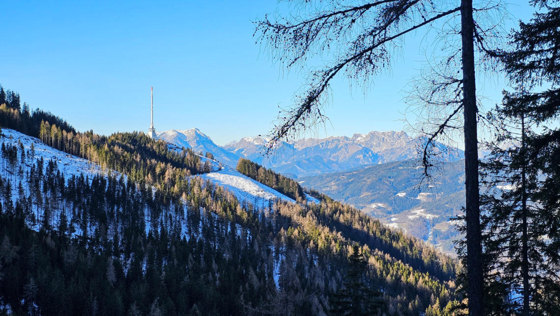 Von hier steigen wir zum Fernsehturm und weiter zur Ochsenalm ab. Davor aber noch Blicke nach Bruck, Kapfenberg bzw. Leoben.