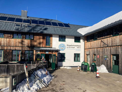 Sommerparkplatz angelangt. Von dort gibt es bald viele Abzweigungen zu den verschiedensten Aufstiegsmöglichkeiten auf die Mugel.
