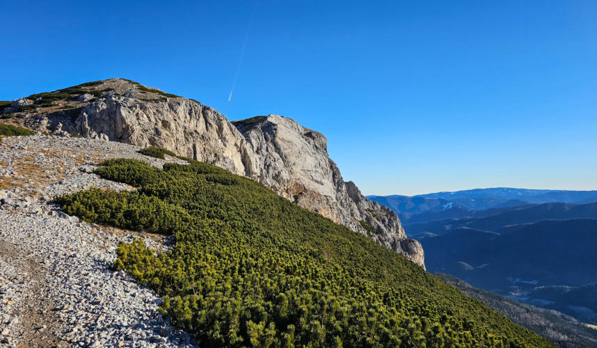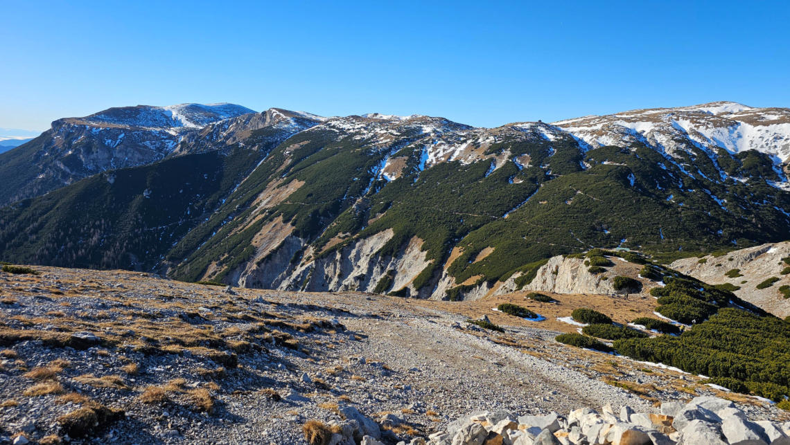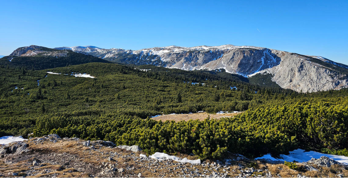 Ein Blick nach Norden - Von der Scheibenwaldhöhe bis zur Heukuppe, jede Menge Berge auf der Rax zu sehen.