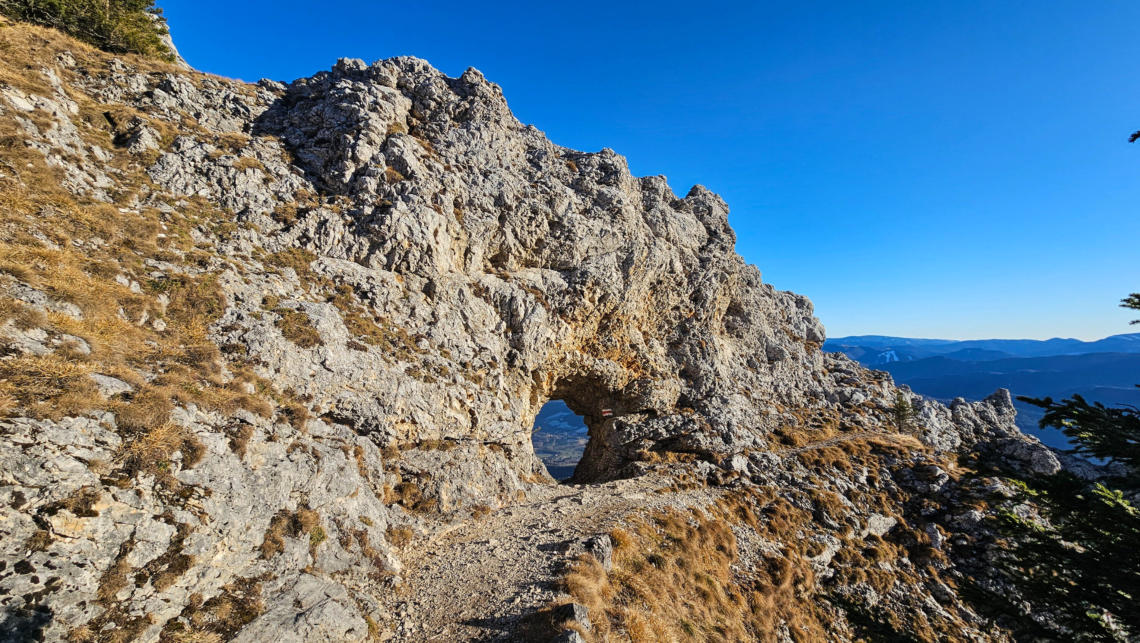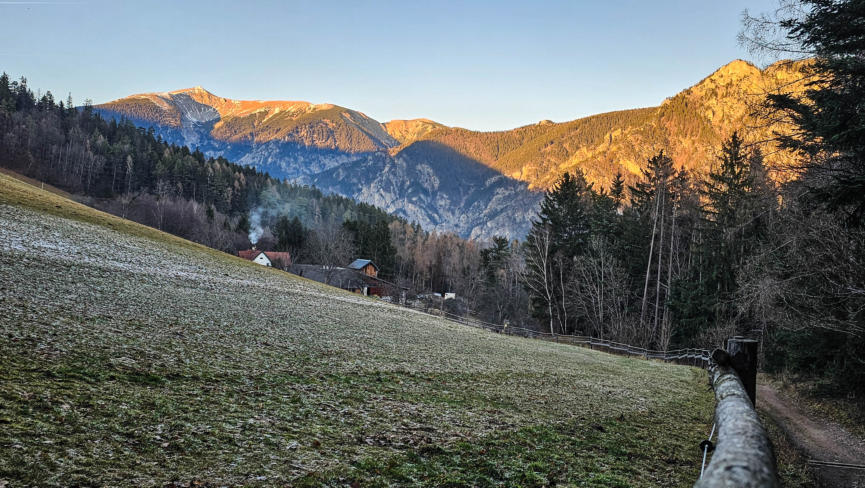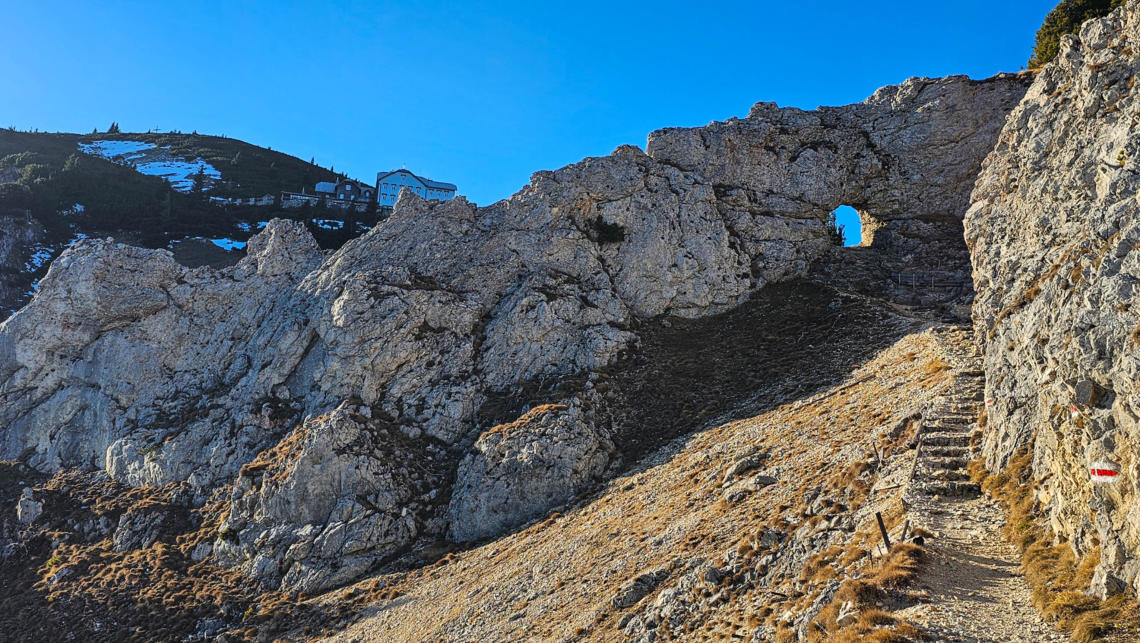 Durch das Tor durch und hinunter nach Hirschwang zur Talstation der Rax-Seilbahn.